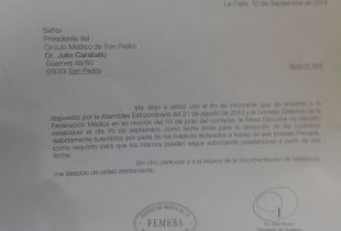 Publicado el Hs.El Presidente del Círculo Médico difundió la nota enviada desde la Federación Médica de la Provincia de Buenos Aires. En la misma se expresa que la fecha límite para firmar contratos era el lunes y en caso contrario no podrían "seguir autorizando prestaciones". FEMEBA difundió un comunicado.