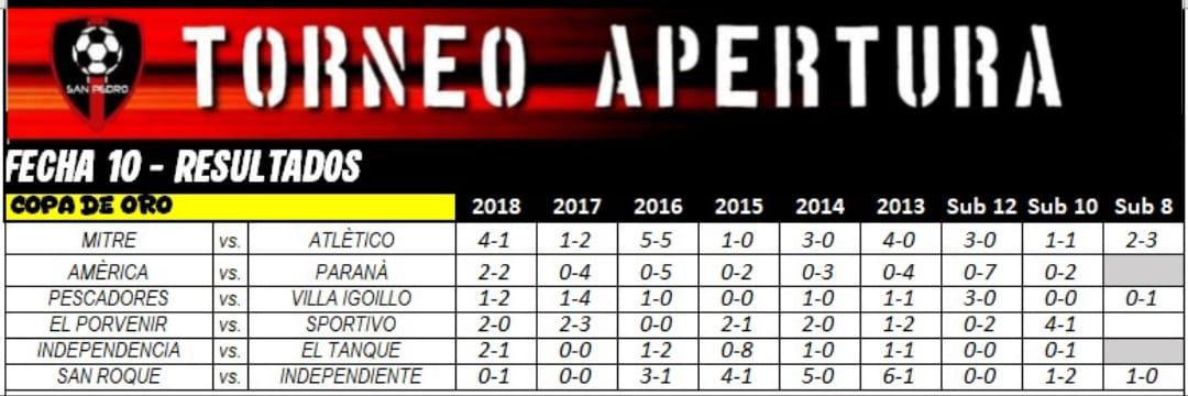 Este sábado, se disputó la 10° y penúltima fecha de la Copa de Oro del Torneo Apertura Horacio Cachi Llull que organiza la Liga de Fútbol Infantil de San Pedro.