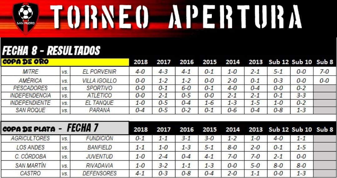 Este sábado, se disputó la 8° fecha de la Copa de Oro y la 7° de la Copa de Plata del Torneo Apertura Horacio Cachi Llul que organiza la Liga de Fútbol Infantil de San Pedro para todas sus categorías, femeninas y masculinas.