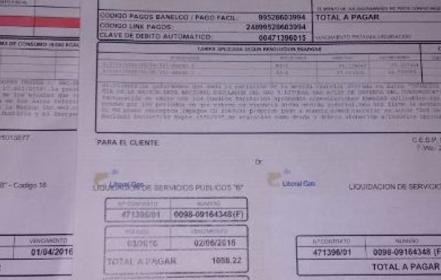 Las facturas de gas reflejan un incremento que en muchos casos supera el 700 por ciento. La boleta que vence en junio incluye un incremento previsto en 2014 por la entonces Presidenta Cristina Fernández y el último ajuste de Mauricio Macri. En la categoría más alta, el metro cúbico pasó de 0.26 centavos a 4,99 pesos. En el escalafón más bajo de la categoría Residencial, de 0,13 centavos a $2,28. Quejas en las oficinas de Litoral Gas.
